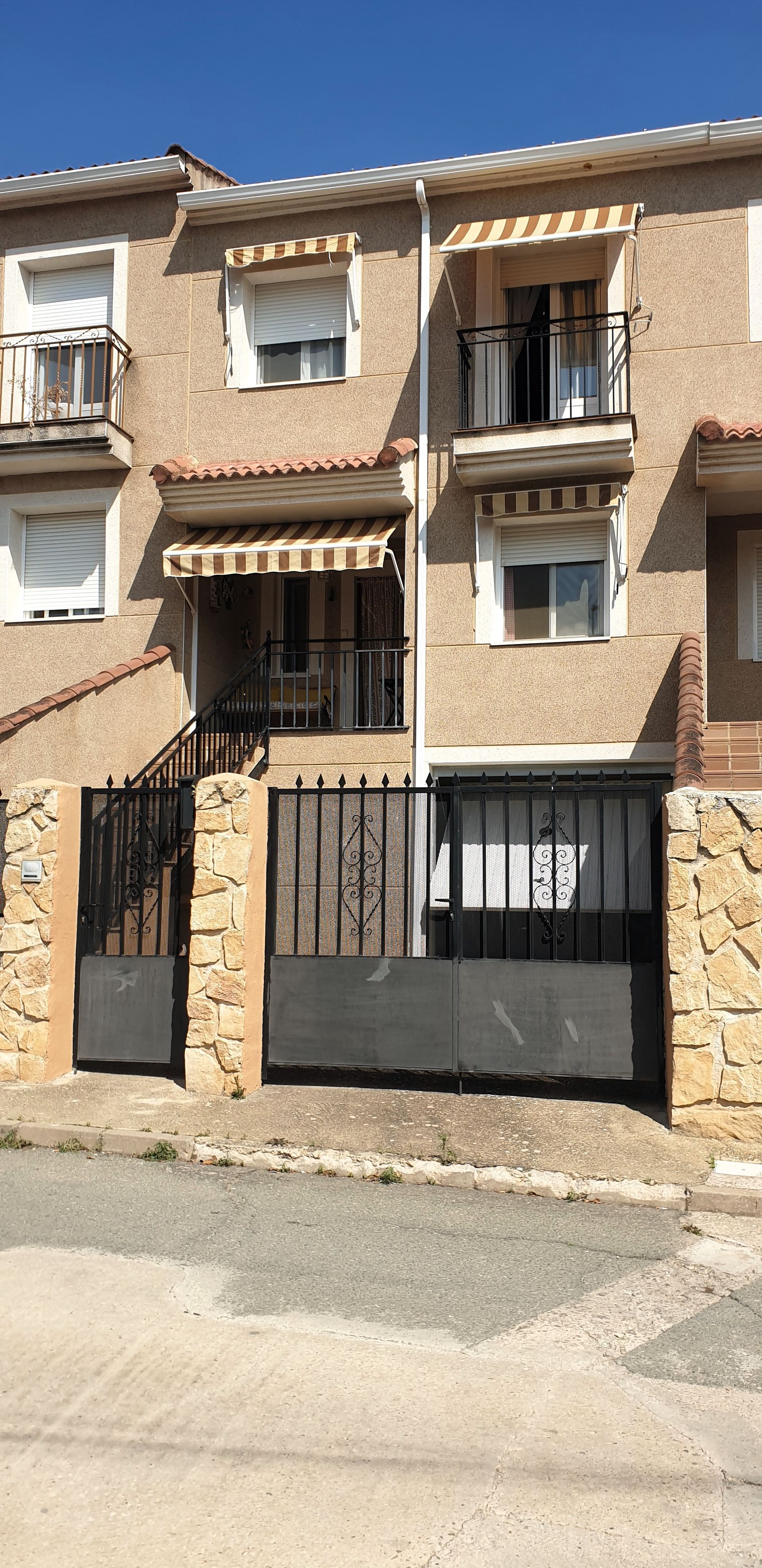 Inmobiliaria Valderribas vende, Chalet adosado en la localidad de Espinosa de Henares, dentro de la Provincia de Guadalajara, con estacion de Renfe y trenes desde Madrid, Alcala y Guadalajara. La vivienda esta para entrar a vivir, 4 dormitorios con armarios empotrados, baño completo con plato de ducha y aseo, cocina amplia totalmente equipada, salon de 25 m2 con salida a patio trasero, suelos de ceramica, paredes lisas, calefaccion individual de gasoil, ventanas de climalit, mosquiteras, toldos, garaje para 3 coches, riego automatico.