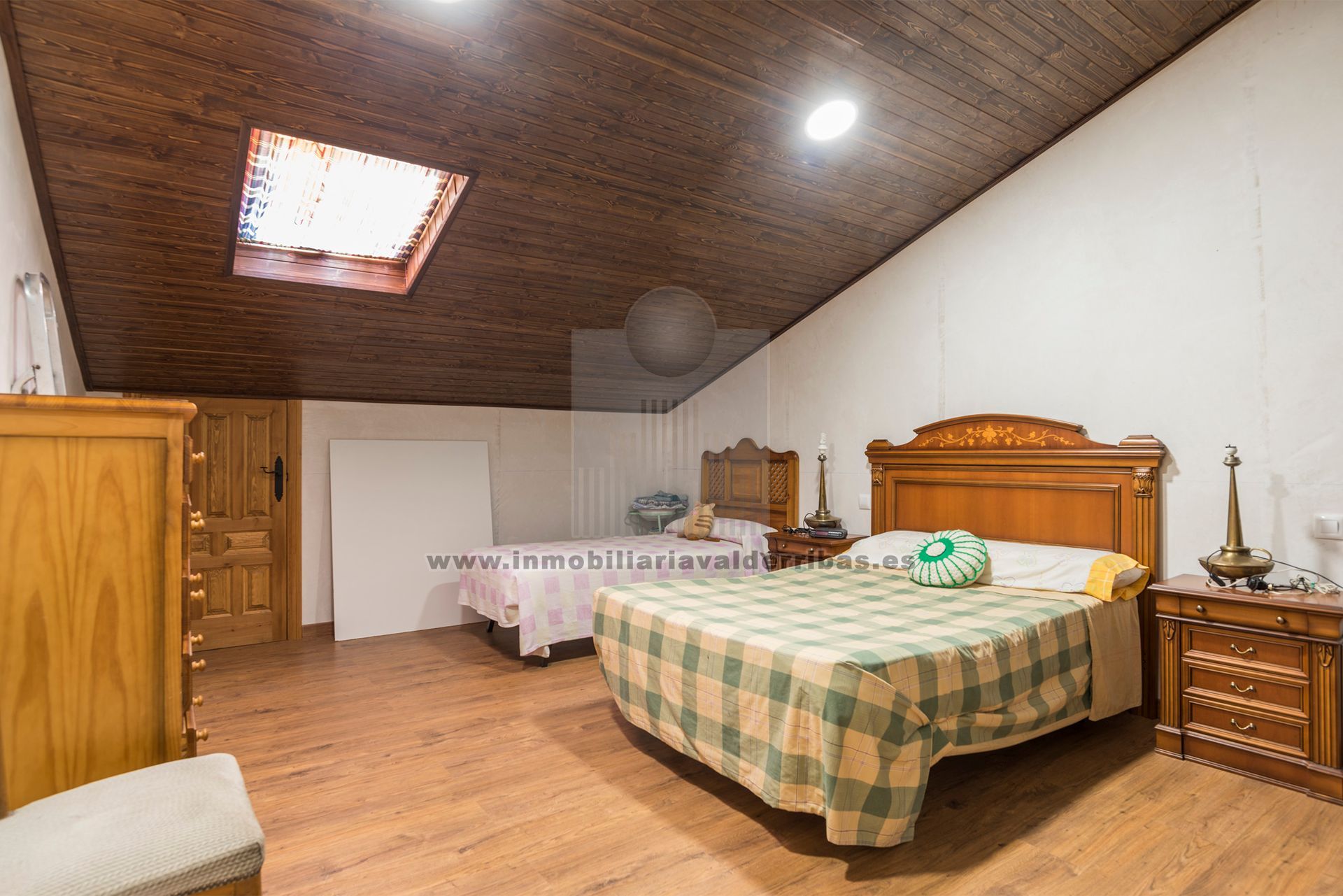 En la primera planta, 3 dormitorios amplios con armarios empotrados, baño con plato de ducha y mampara, suelos de tarima, techos de madera, salon, la calefaccion es de gasoil con radiadores individuales en cada habitacion y termostato independiente para cada planta.