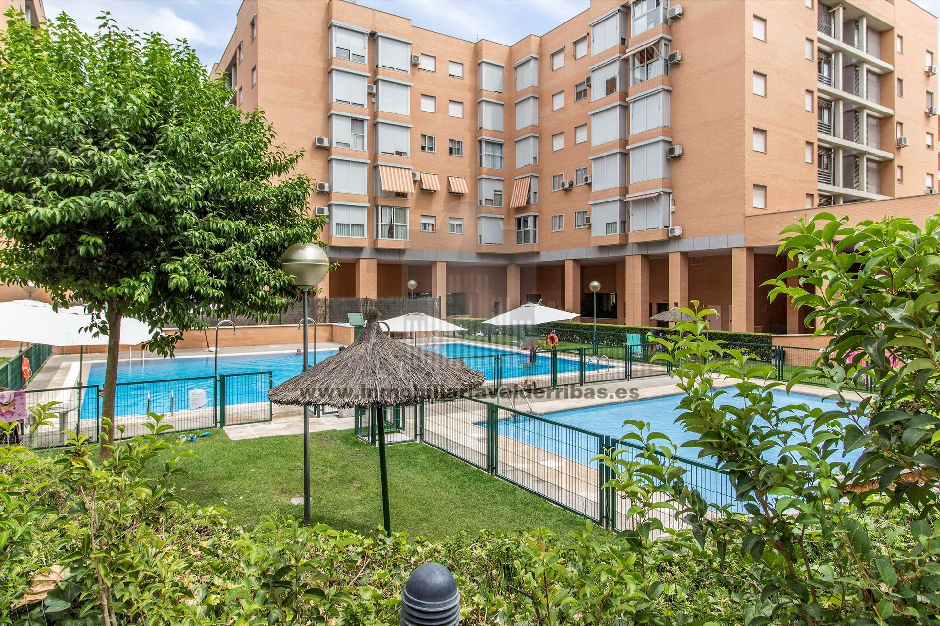 Inmobiliaria Valderribas, vende en exclusiva, piso de 3 dormitorios, 94 m2 utiles, salon independiente con mirador, VISTAS AL PARQUE, cocina amplia con tendedero cubierto, 4 armarios empotrados, 2 baños completos, suelos de parquet, doble ventana, calefaccion de gas natural individual, plaza de garaje, trastero, urbanizacion cerrada con vigilancia 24 horas, dos piscinas (adultos y niños), parque infantil, sala de reuniones, bien comunicado, ubicado frente al Parque y a Faunia, supermercados, colegios, guarderias, todo muy cerca, autobus a 100 metros (71, 100, E-3), metro y renfe a 15 minutos andando, a 2 min. de A-3, R-3, M-40, M-45 y O¨Donnell.